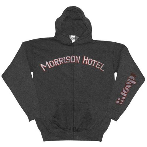 This high quality, grey hooded sweatshirt features 'Morrison Hotel' printed across the front, along with the Doors logo printed down the sleeve. Other features include a zip-up front with two front pockets, drawstring hood, and banded waist and wrists for added warmth and comfort.Images ScreenShot