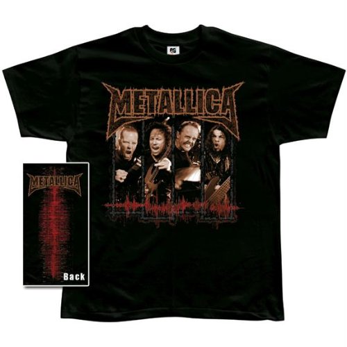 Seismic waves of sound are pictured emanating from metallica on the standard cotton short sleeve t-shirt. It comes in black and features the band members on the front and metallica logo on the back. Great for any metallica fan.Images ScreenShot