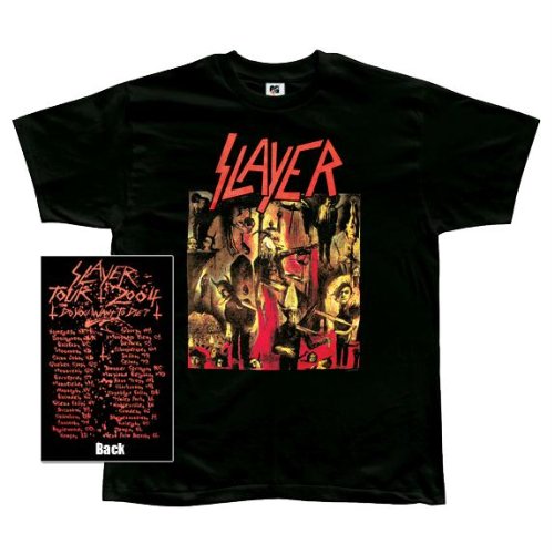 Cover art from "Reign In Blood", the 1986 album by slayer, is featured on the front of this black cotton t-shirt. The back lists the cities from their 2004 Do You Want To Die? Tour.